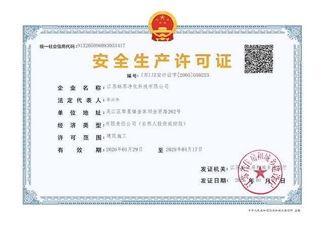 江苏姑苏净化科技有限公司,具有国家电子与智能化工程壹级资质,国家机电安装工程壹级资质,国家建筑装修装饰工程壹级资质 姑苏净化科技有限公司,具有国家机电工程施工总承包贰级、国家空气净化工程二级资质,国家电子与智能化工程二级资质,国家机电安装工程二级资质,国家建筑装修装饰工程二级资质,消防设施工程专业二级资质企业。